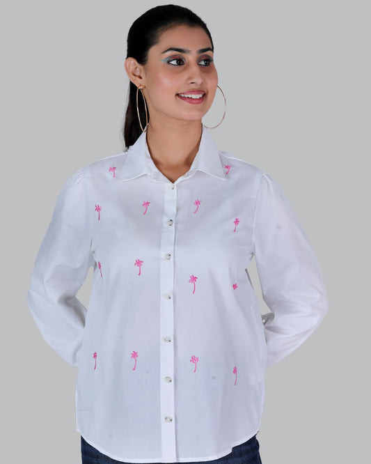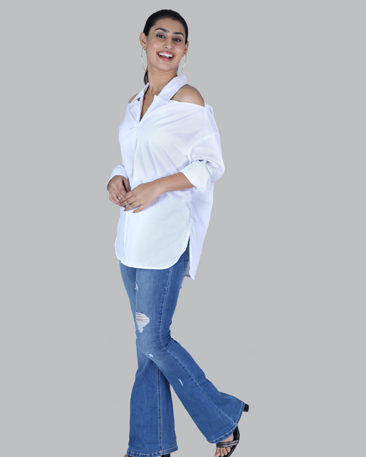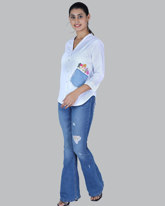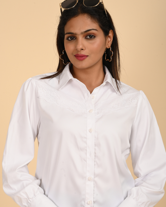 Elegant white Satin Shirt with Tonal Lace Detail.