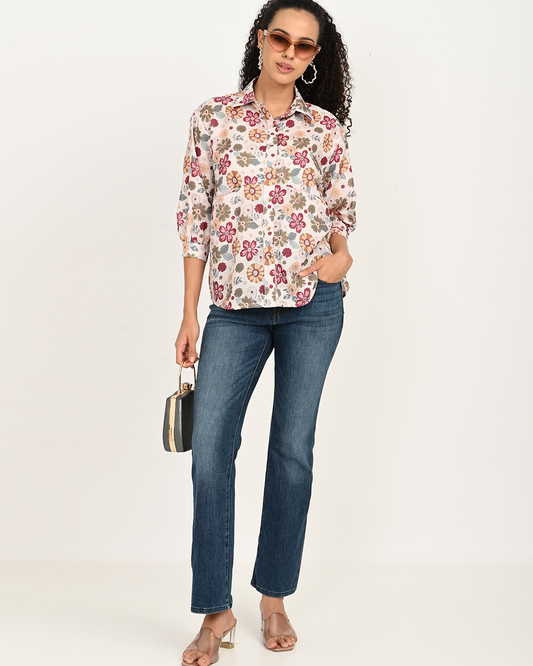 Cream & Maroon Floral Digital Print Cotton Top for Women | The Classy Clothing