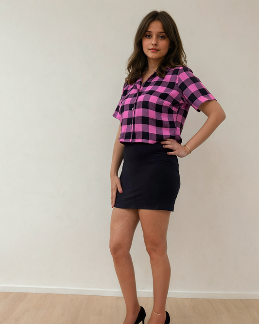 Pink & Black Checkered Yarn Dyed Rayon Crop Top for Women | The Classy Clothing